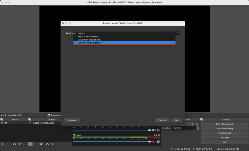 Ensuite, assignez la carte son virtuelle pour cette source. Dans cet exemple: ‘iShowU Audio Capture’