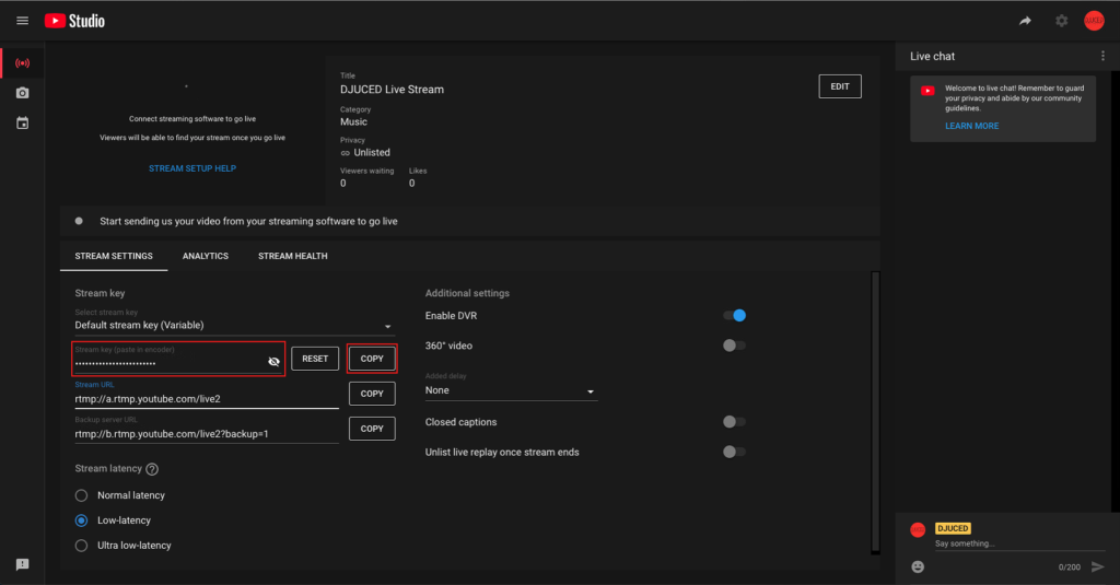 Allez dans Youtube Studio, suivez les instructions pour créer votre flux et copiez la « Clé de flux ».