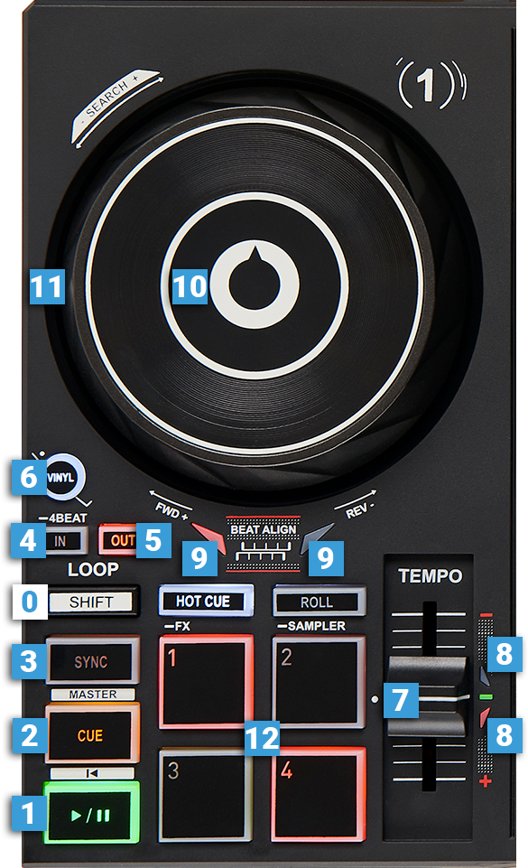 | 11 – Anneau Exterieur du Jogwheel | Utilisez l’anneau extérieur pour ralentir ou accélérer temporairement la piste que vous êtes en train de jouer. | Parcourt la chanson en entier. |