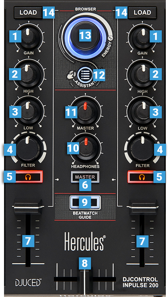 | 14 – Load | Simple pression = Charger la chanson sélectionnée dans la liste du Browser ou de l’Assistant dans la platine gauche/droite. Appui long (1 sec) = Instant Double |