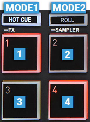 Appuyez sur le bouton MODE 1 pour mettre les Pads en mode Hot Cue. Le mode « Hot Cue » est le mode de pads par défaut.