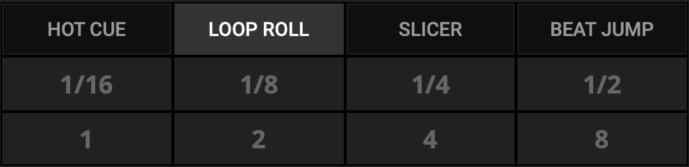 | PADS 1 – 8 LOOP ROLL | Press and hold one of the 8 PADS performs a temporary Auto Loop from 1/16 of a Beat (PAD 1) to 8 Beats (PAD 8) It allows making from 1/16 to 8 beats loops and “stutter” effects without losing the phrase of the track. When the PAD is released, the playback position returns to the position it would have been if nothing had been done. |