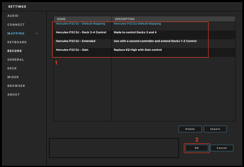 Go into DJUCED Settings > Mapping tab to choose a mapping (1) and click OK (2) to apply it.