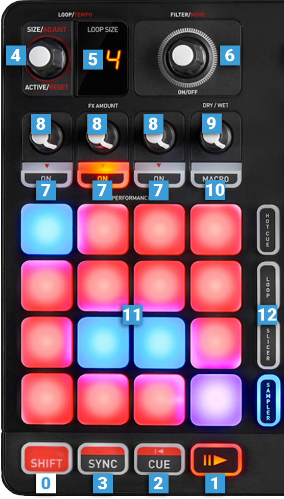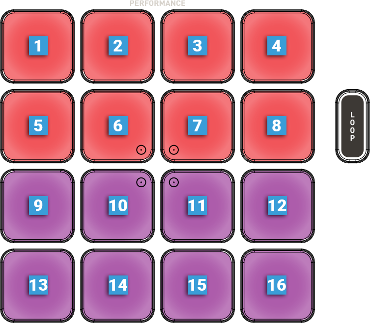 | PADS 9 – 16 LOOP | Press to create an Auto-Loop from 1/16 of a Beat (PAD 9) to 8 Beats (PAD 16) |