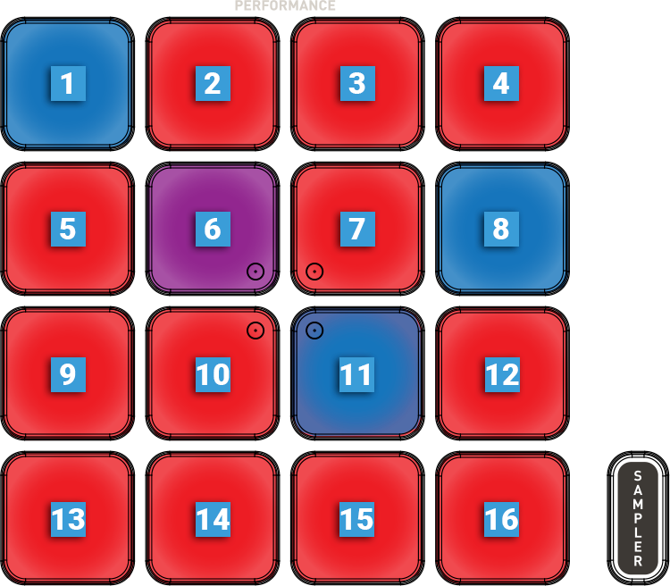 | PADS 1 – 16 | When a sample is assigned to a Pad, press the pad to trigger this sample. There are 3 different playback modes: One-shot: Play when pressed, restart when pressed again Hold: Play when pressed, stop when released Toggle: Play when pressed, stop when pressed again In all the modes, the samples can be looping or not. Tip: PAD is RED: Sample is stopped PAD is BLUE: Sample is playing PAD is PURPLE: Sample is waiting to play in the next Quantize beat | Stops the playback if the sample is set to a loop. |