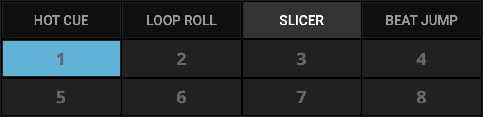 | PADS 1 – 8 | The Slicer Mode divides an active loop into 8 Slices and will slide all along the track. Press and hold one of the 8 PADS performs a slice that can be triggered in real-time, and allow you to jump between different sections of an active loop. Once a slice is triggered, looping will begin within the selected Slice for as long as the pad is depressed. |