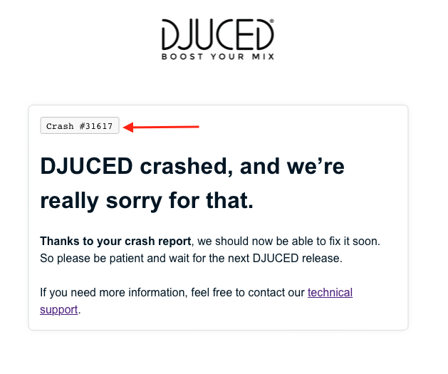 Si DJUCED s’arrête de manière inopinée et que la fenêtre « BugSplat » s’affiche au démarrage suivant, vous demandant si vous voulez partager le dernier crash avec les développeurs, merci de le faire.