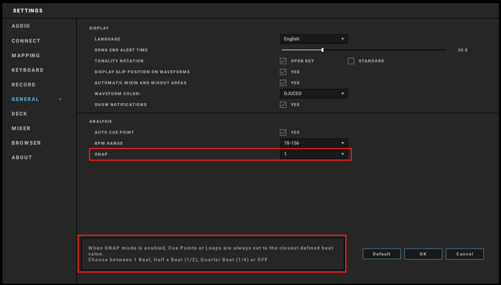Si vous souhaitez placer les points CUE librement, vous pouvez désactiver la fonction SNAP to grid dans DJUCED Settings => General =>Analyse