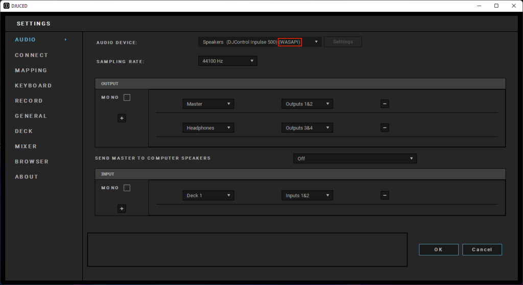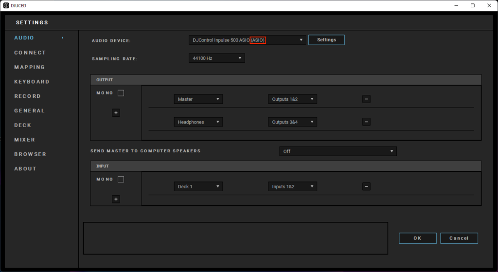Après avoir installé les pilotes ASIO, veuillez accéder aux paramètres audio DJUCED et utiliser la carte son ASIO de votre contrôleur au lieu de la carte WASAPI.