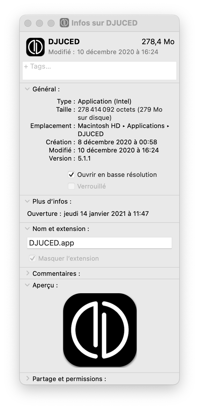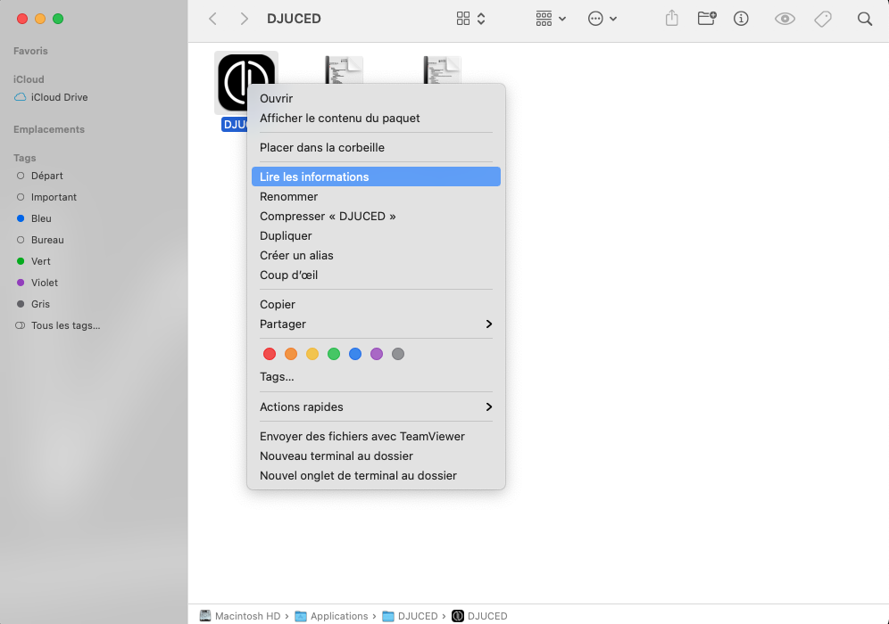 Faites un clic droit sur l’icône de l’application DJUCED et choisissez « Lire les informations ».