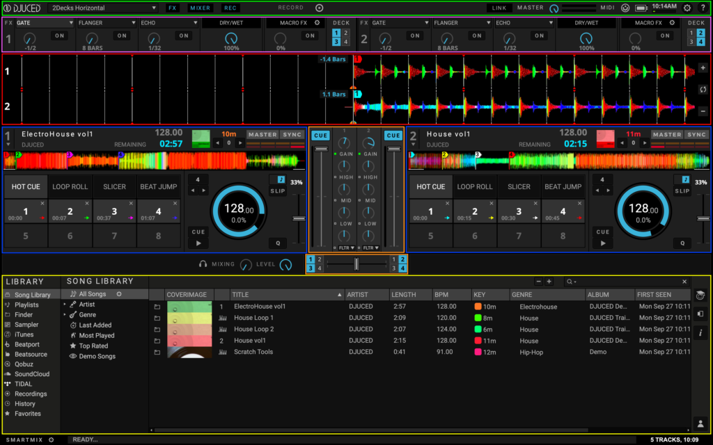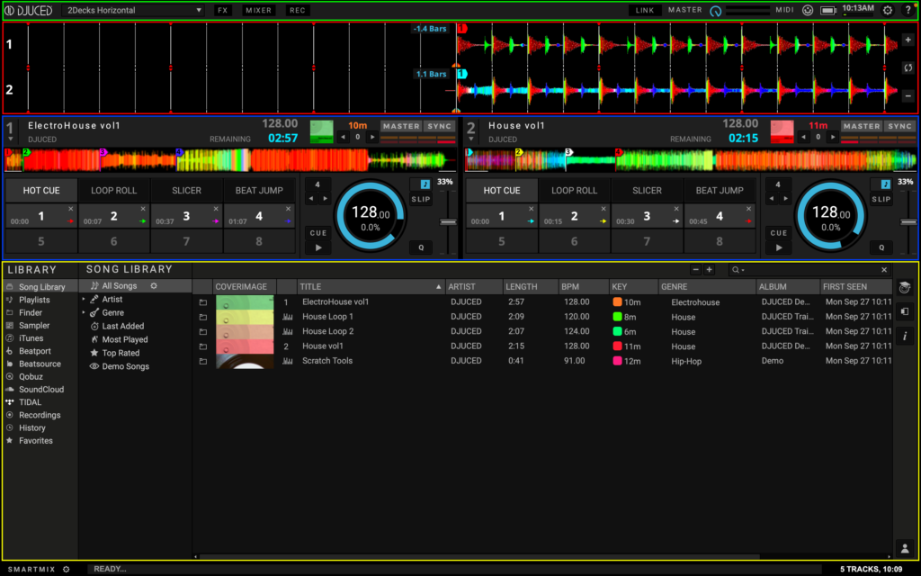 Cette interface affiche la barre supérieure (en VERT) deux platines (en BLEU) avec des formes d’onde horizontales (en ROUGE) et le navigateur (en JAUNE) avec les icônes d’accès rapide.
