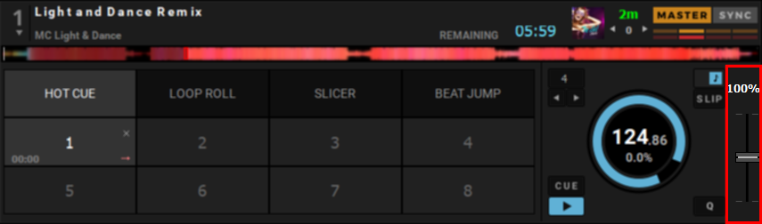 Lorsqu’une piste est chargée dans une platine, DJUCED modifie automatiquement la plage du pitch fader pour obtenir la meilleure plage pour la différence de BPM entre les pistes.