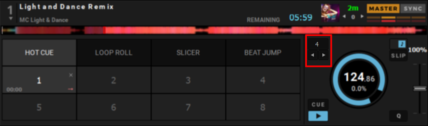 DJUCED vous permet de choisir une valeur SNAP de 1/32 de temps à 1 temps. Grâce à SNAP, les boucles commencent et finissent parfaitement en rythme et les points CUE se positionnent parfaitement dans le battements. Avec une valeur de 1 temps, les boucles et les points CUE seront toujours alignés sur les battements.