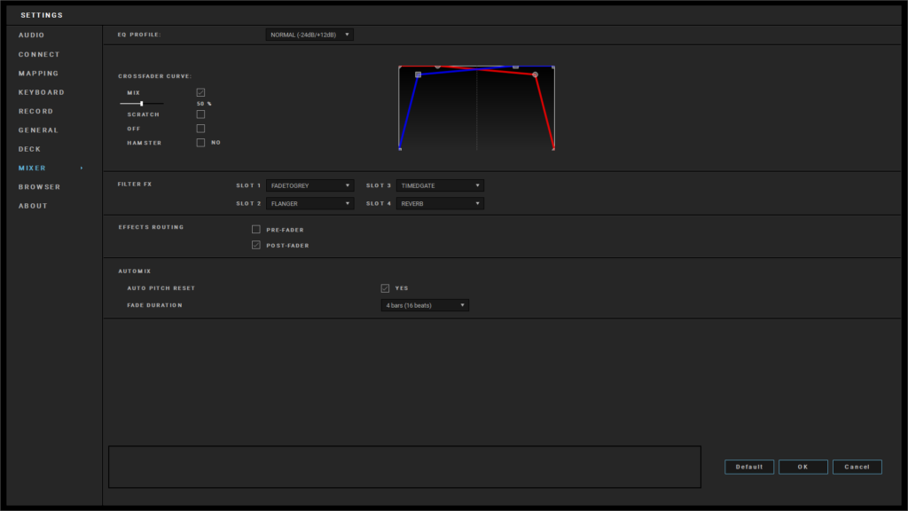 Ici, vous pouvez régler la courbe du crossfader, choisir les filtre/FX et le routage des effets.