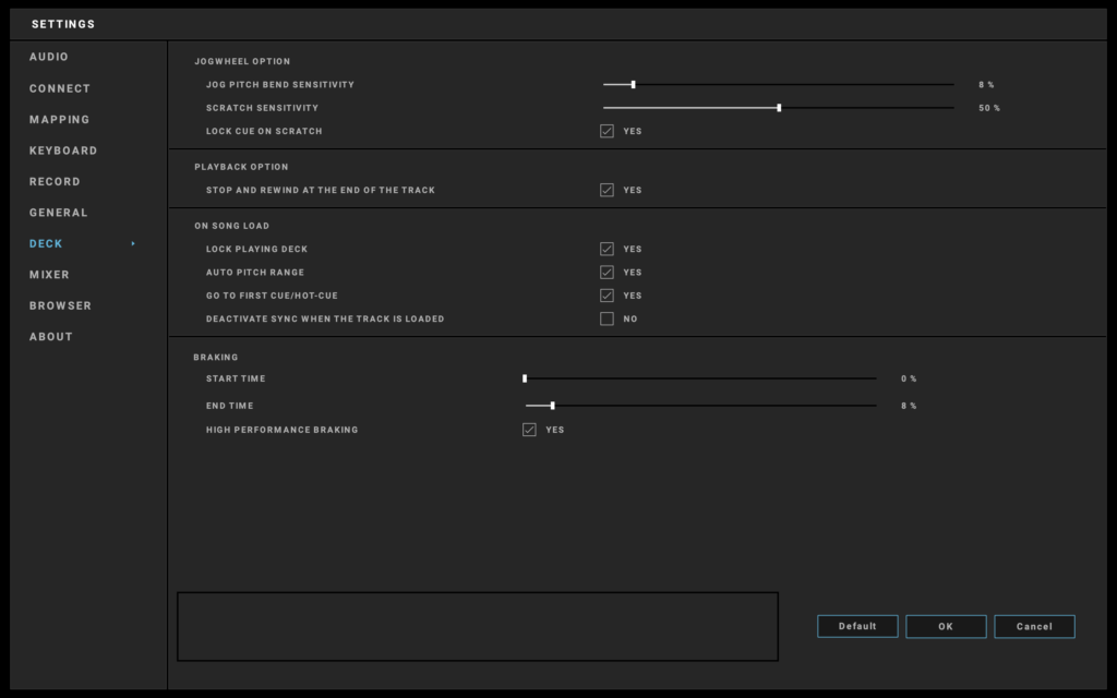 Ce paramètre spécifie la sensibilité des jogwheel de défilement pendant le scratch. Cela s’applique en mode Scratch lorsque la jogwheel est tournée tout en étant pressée.